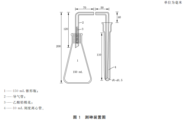 10.4.1砷標準儲備液(100mg/L,按As計):準確稱取于100℃干燥2h的三氧化二砷0.0132g,加100g/L氫氧化鈉溶液1mL和少量水溶解,轉入100mL容量瓶中,加人適量鹽酸調(diào)整其酸度近中性,加水稀釋至刻度。4℃避光保存,保存期一年。或購買經(jīng)國家認證并授予標準物質(zhì)證書的標準溶液物質(zhì)。