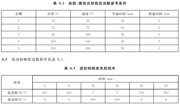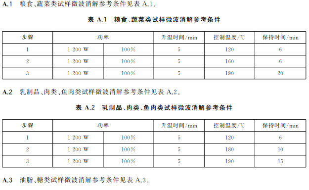 蔬菜、水果等含水分高的樣品,稱取2.0g~4.0g(精確至0.001g)樣品于消解罐中,加入5mL硝酸,放置30min;糧食、肉類、魚類等樣品,稱取0.2g~0.5g(精確至0.001g)樣品于消解罐中,加入5mL硝酸,放置30min,蓋好安全閥,將消解罐放入微波消解系統(tǒng)中,根據(jù)不同類型的樣品,設置適宜的微波消解程序(見表A.1~表A.3),按相關步驟進行消解,消解完全后趕酸,將消化液轉移至25mL容量瓶或比色管中,用少量水洗滌內(nèi)罐3次,合并洗滌液并定容至刻度,混勻。同時作空白試驗。