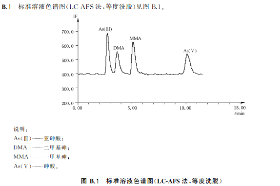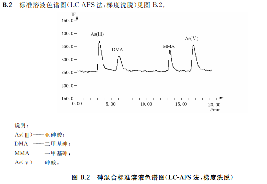 吸取試樣溶液100L注入液相色譜-原子熒光光譜聯(lián)用儀中,得到色譜圖,以保留時間定性。根據(jù)標準曲線得到試樣溶液中As(Ⅲ)與As(V)含量,As(Ⅲ)與As(V)含量的加和為總無機砷含量,平行測定次數(shù)不少于兩次。