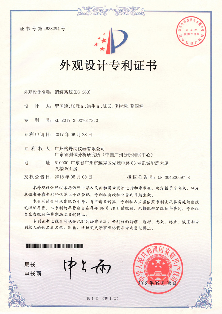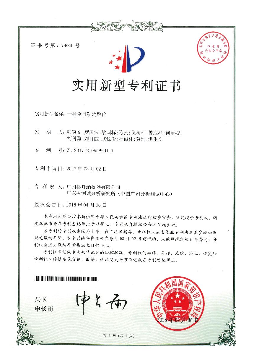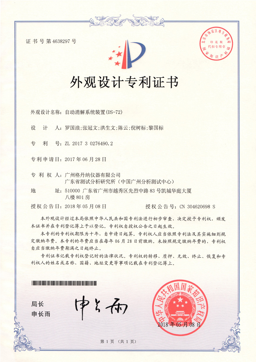 • 一種全自動消解儀-實(shí)用新型專利證書