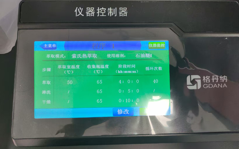 參數設置:通過外接控制器的大屏幕界面,演示如何根據檢測需求選擇萃取方法(如經典索氏萃取法、熱萃取法),并設置加熱溫度、萃取時長等參數,同時講解參數保存與調用功能,方便后續同類樣品檢測;